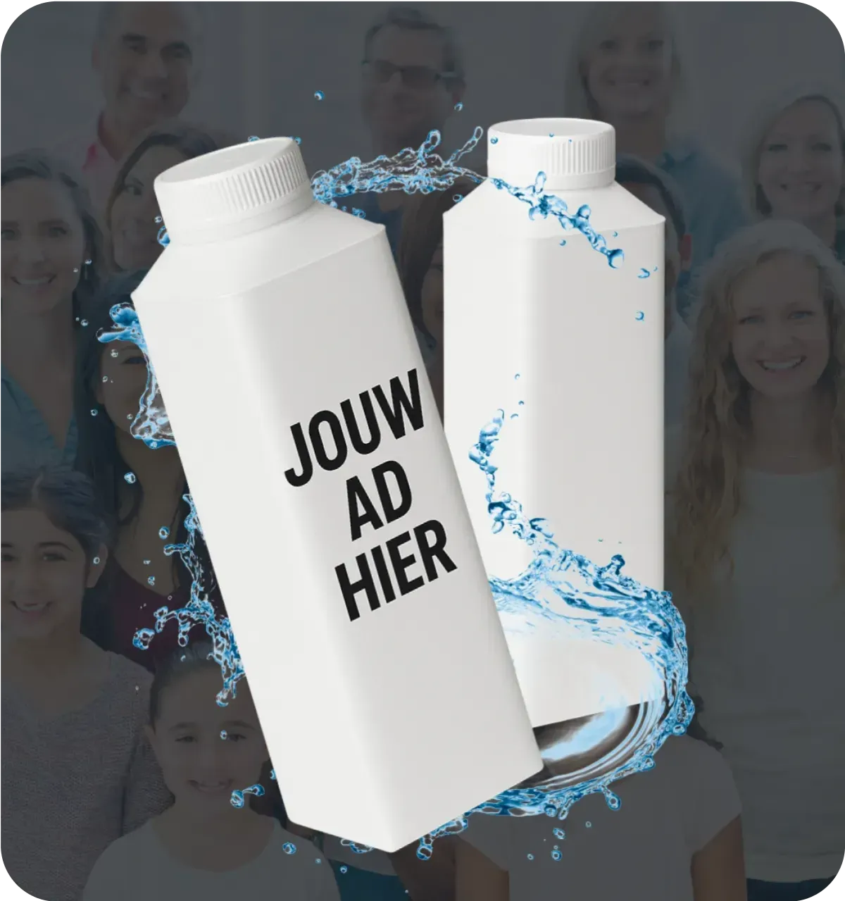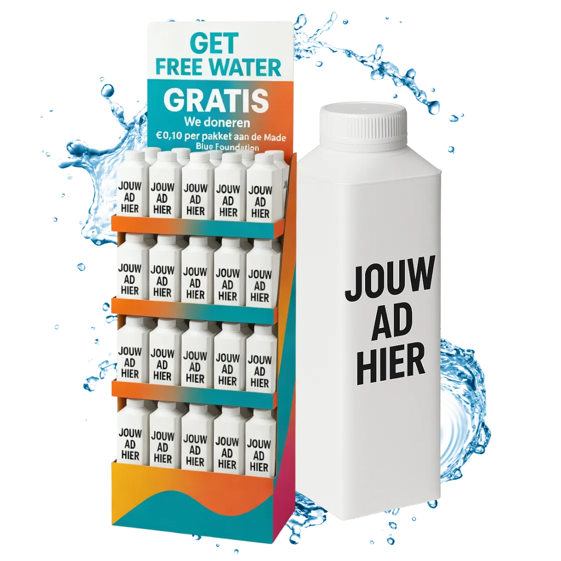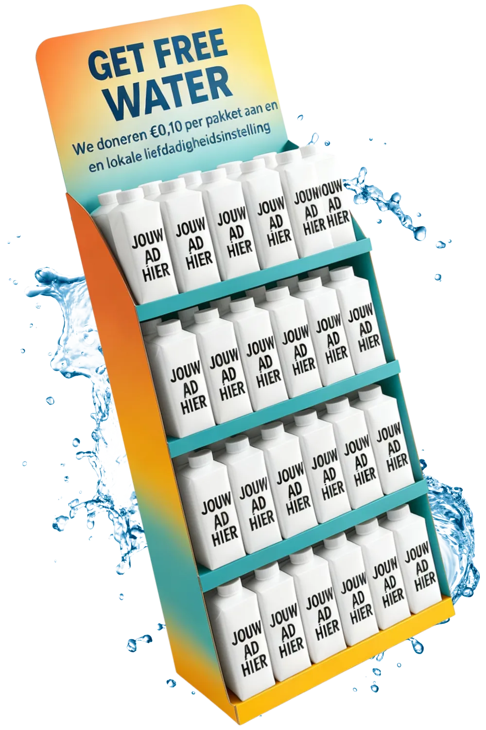 Jouw merk op gratis waterverpakkingen die worden uitgedeeld op drukbezochte A-locaties zoals winkelcentra, supermarkten, events en sportclubs. Zo wordt jouw boodschap gezien, onthouden en geassocieerd met iets positiefs — terwijl je schoon drinkwaterprojecten wereldwijd helpt financieren.